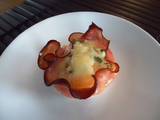 Spray muffin tins with Pam. Line each cup with a slice of deli ham. Break an egg gently into each ham cup. Season with salt and pepper, sprinkle with chopped chives. Bake at 350F for about 15 minutes. Remove from oven and top each egg with grated cheese and bake for 5 minutes longer.