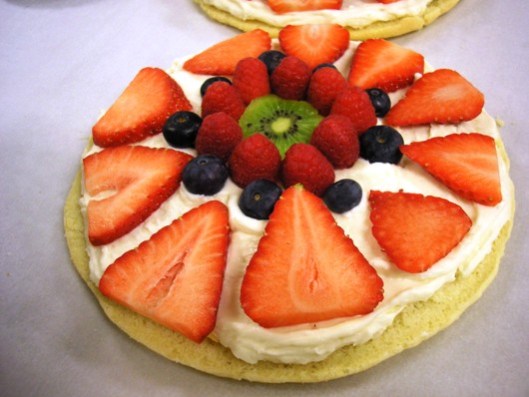 For those of you who aren’t chocolate lovers, here’s a sugar cookie crust, fruit topped version of a dessert pizza.